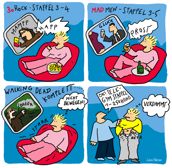 Wie man TWD am Stück weggucken kann, ist mir ein Rätsel. Diese Serie ist so deprimierend (ich meine das Setting, nicht die Schauspieler), dass ich mir mehr als eine Folge alle paar Wochen nicht antue. Stattdessen hole ich Breaking Bad nach (ist aber ebenfalls teilweise schwerer Tobak).